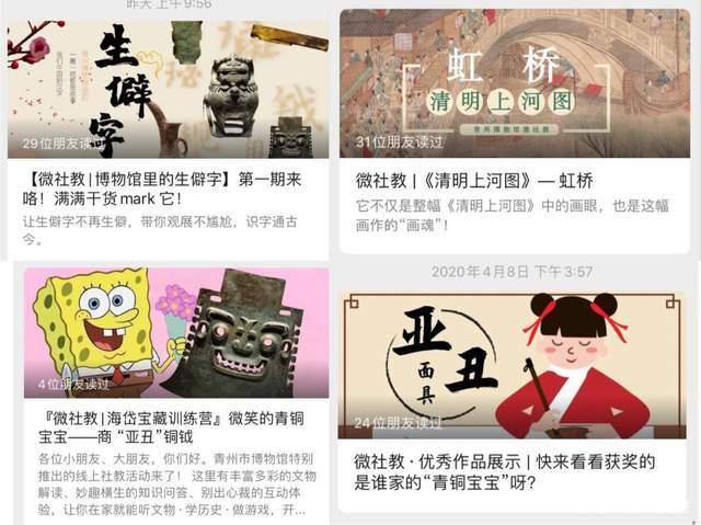 作为观众与博物馆沟通互动的桥梁, 青州市博物馆充分利用举办展览、节假日等契机,不断推出各种社会教育活动,如结合“5·18世界博物馆日”、文化遗产月、中秋等节日,举行各种线上宣传教育活动,通过吸引公众参与,达到宣传文物,推介产品、展示文化、弘扬传统的目的。同时还不断优化微信公众平台的功能结构,注重对用户数据进行分析,如用户增减数据、语言、图文消息的到达率、阅读率、转发收藏率等,通过数据分析不断调整博物馆的线上教育项目类别,从而实现精准化宣传。